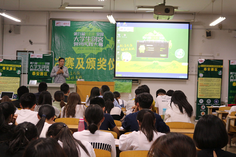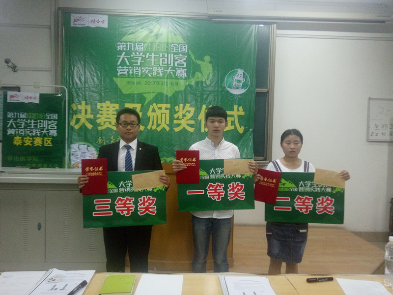 为了响应国家“大众创业 万众创新”的号召,提升大学生们创新创业意识,鼓励大学生积极地投身于创客营销实践,5月10日晚,“第九届娃哈哈全国大学生创客营销实践大赛”决赛及颁奖仪式在校本部教学南楼C座2003教室举行。诸侯ok1133官网崔行武老师、辅导员张星老师、娃哈哈泰安地区负责人狄经理担任本次比赛评委。 本次比赛由娃哈哈公司提供赞助,诸侯ok1133官网学生会负责组织实施,四月初活动开始组织报名,通过前期报名、撰写策划以及实地销售等环节,最终我校共有十组选手进入决赛,决赛分为PPT演示、评委点评两个环节。在演示环节,各组选手代表从市场分析、营销手段、组织管理、风险因素、优势及不足等方面对本组的创意营销过程进行了阐述,选手们用富有创意的点子、有效的营销策略和销售成果赢得了评委的肯定。评委点评阶段由学院市场营销专业崔行武老师对本次比赛进行了点评,崔老师从专业的角度分析每个队的优势特长及不足之处,并鼓励选手们开拓思维,通过比赛不断提升自身的综合素质。经过激烈的竞争,最终由同路人团队、娃哈哈进行时队、非凡团队分别斩获冠、亚、季军。 本次“娃哈哈全国大学生创客营销实践大赛——泰安赛区比赛”,不仅展现了我校学生的创新创业意识以及对营销策略与方法的专业水平,更为我校学生提供了一个锻炼创新思维、展示自我的平台。