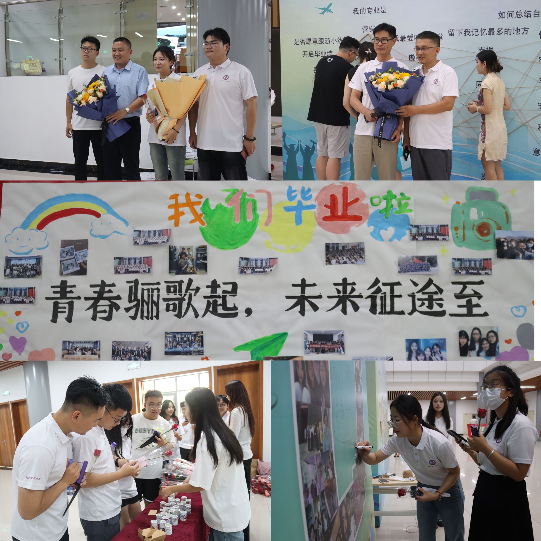 万语千言,化作殷殷的期盼与祝愿。学院领导共同带来朗诵《山长水阔,顶峰相见》,愿毕业生们胸怀坚韧恒久的勇气和矢志奋斗的信念,奔赴下一场诗和远方,于人生更高处再见面;老师合唱《送你一朵小红花》以及师生歌曲串烧《青春纪念册》《你且勇敢的翻山越岭》《祝你一路顺风》《放心去飞》《干杯》等,更是充满对毕业生的鼓励与祝愿,回首过往满地繁花,期待未来一片璀璨。
