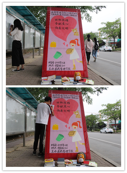 此次捐赠活动的主题是:旧物捐赠,奉献爱心和传递文明。活动举行分为前期宣传和活动进行两个阶段。前期宣传是从6月13日至14日,主要是教学区张贴、分发倡议书;在学生公寓楼张贴手绘海报、摆放活动宣传板;通过学生干部下达活动通知三个途径。捐赠活动具体流程包括:摊点接待、信息登记、爱心回赠、物品存放。6月15日上午,在2019届毕业生代表张泽宣读了毕业生捐赠活动倡议书之后,捐赠活动正式开始,2019届毕业生纷纷捐出自己要传递给学弟学妹的物品。活动得到了学院广大毕业生的积极响应,累计收获毕业生捐赠书籍百余本,各类生活用品20余件。很多低年级同学们也在捐赠物品中找到了自己需要的书籍或生活用品,并且表达了对于学长们的感谢,纷纷表示要继承毕业生学长们勤俭节约乐于奉献的优良品质,努力提高自己的各方面能力、丰富自己的课业文化生活,不辜负学长们的一片心意。