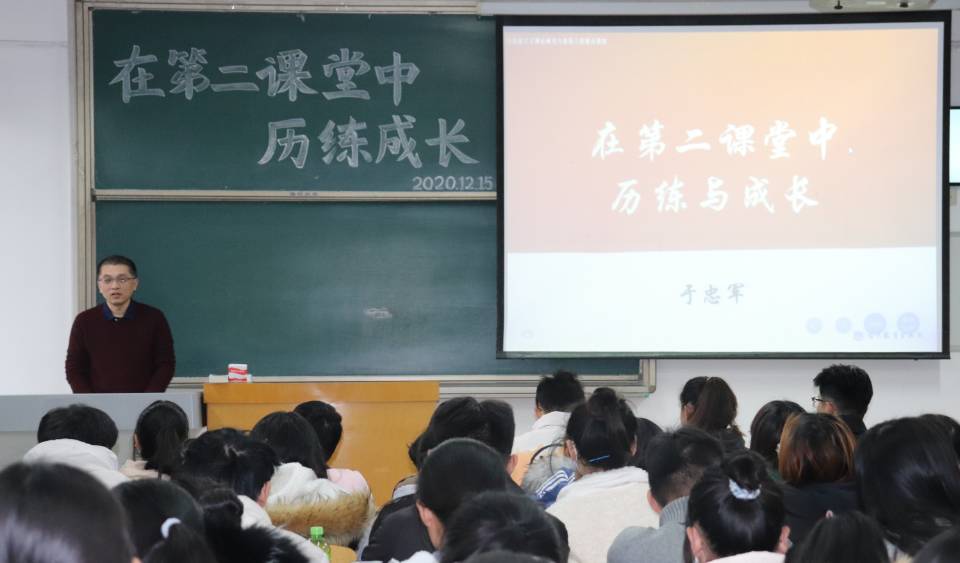 12月15日下午,诸侯ok1133官网在教学南楼C座1003教室成功举办了在第二课堂中历练成长”科技创新主题讲座。本次活动邀请了诸侯ok1133官网工商管理系系主任于忠军教授作为本次讲座主讲人,2020年山东省“创青春”创业计划大赛获奖代表队成员分享了自己的参赛经验,100余名学生参加了本次活动。