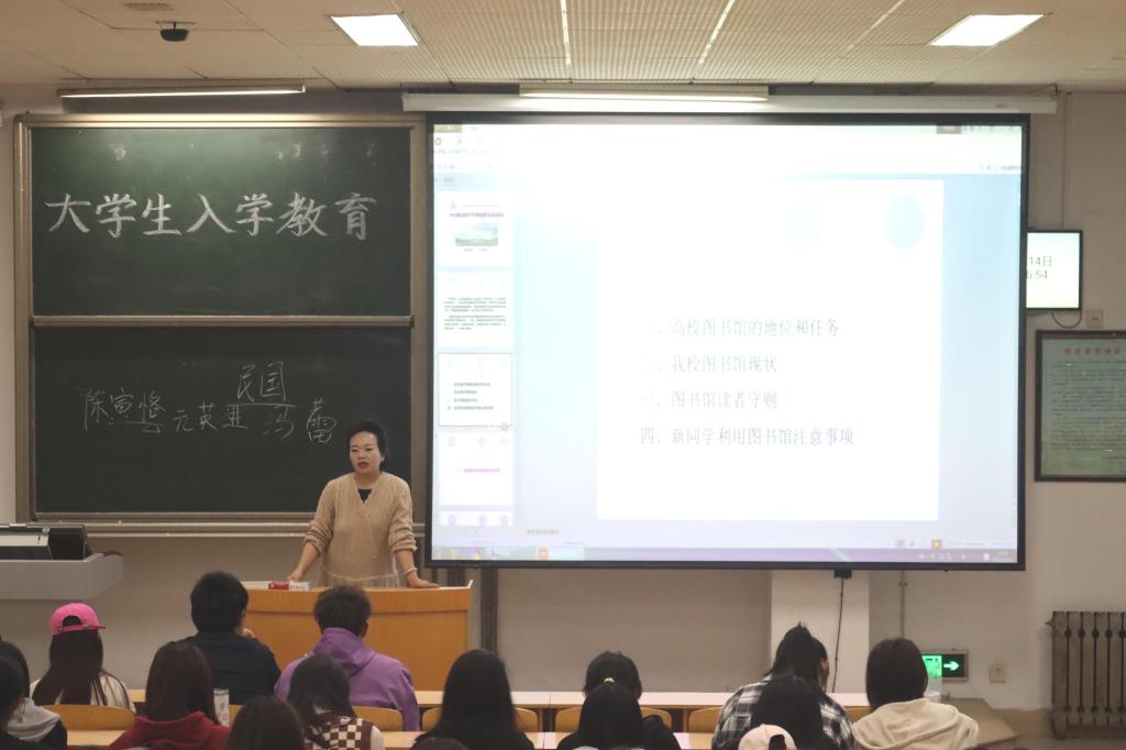 冯蕾从三个方面为同学们全方位多角度地介绍了图书馆在大学生活中的不可替代性,介绍了我校图书馆的现状以及新生利用图书馆的注意事项。首先,冯蕾为学生讲述了书籍在同学们四年学习生活中的重要性。大学是同学们有效利用身边资源,规划人生的平台。图书馆全体教职工始终坚持以加强内涵建设,提高服务水平,营造浓厚的学习氛围为目标,激发了同学们开创美好未来的内心源动力。随后,冯蕾为大家讲解了我校图书馆机构设置和队伍建设、馆舍的分布和面积、各部门的职责以及我校图书馆文献图书的藏量。最后,冯蕾为新生们详细讲述了利用图书馆的一些基本知识。例如,座位预约的方式、图书馆的开放时间、图书馆的电子资源概况、特色服务等,帮助新生更好地了解图书馆,利用图书馆,充分满足学生学习研究等方面的文献需求。