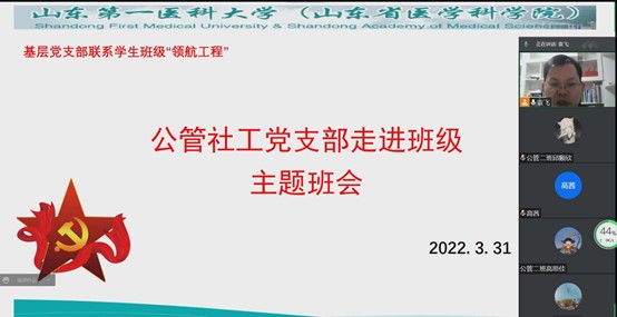 支部书记袁飞老师首先向同学们简要介绍了公管社工党支部的基本情况,和校(院)党委实施基层党支部联系学生班级“领航工程”的目的与意义。随后,就学生们学习、生活中关注的问题,支委会同志们进行了逐一解答,并就疫情期间如何调适心态,做到快乐学习、健康生活提供了科学建议。