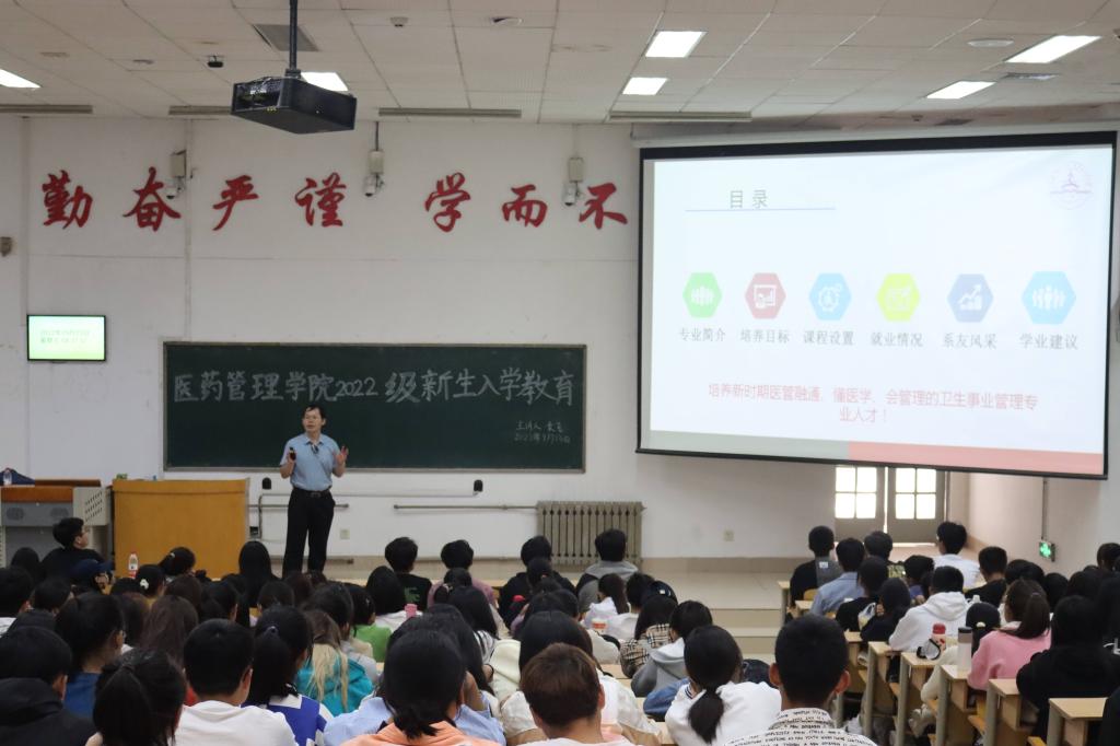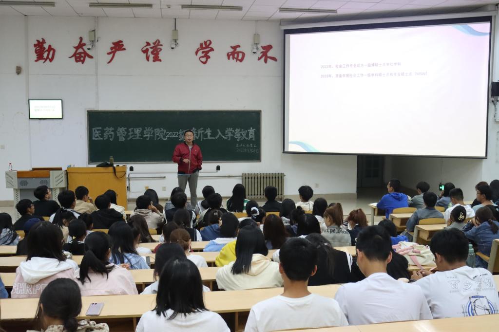 公共事业管理系主任袁飞老师在分享会上为同学们介绍了公共事业管理专业“医管融通、懂医学、会管理”的培养目标。随后,从专业简介、培养目标、课程设置、就业情况、系友风采、学业建议等方面展开详解,让2022级新生更加全面地了解公共事业管理专业。此外,袁飞希望同学们用目标、执行、自律、自省着四个标准去要求自己,培养自己的兴趣爱好,确立明确的目标,积极主动地参与到学习和实践当中,做到全面发展,并衷心祝愿2022级新生健康、快乐、学业有成!