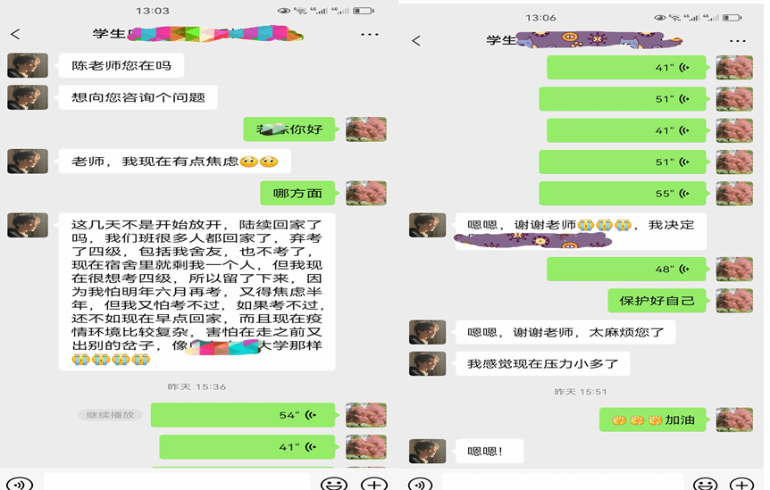 面对当前严峻的疫情防控形势,诸侯ok1133官网本科生导师坚持以学生为中心,全面落实立德树人根本任务,时刻牵挂学生,人文关怀与学业指导不停歇,为本科生学习、生活保驾护航。封闭管理期间导师们围绕思想动态、积极抗疫、生活作息、专业学习等相关主题,组织开展了以线上为主、内容丰富的交流活动,引导学生保持平和心态、加强自我防护、注意饮食作息、积极参与线上学习,面面俱到,事无巨细。