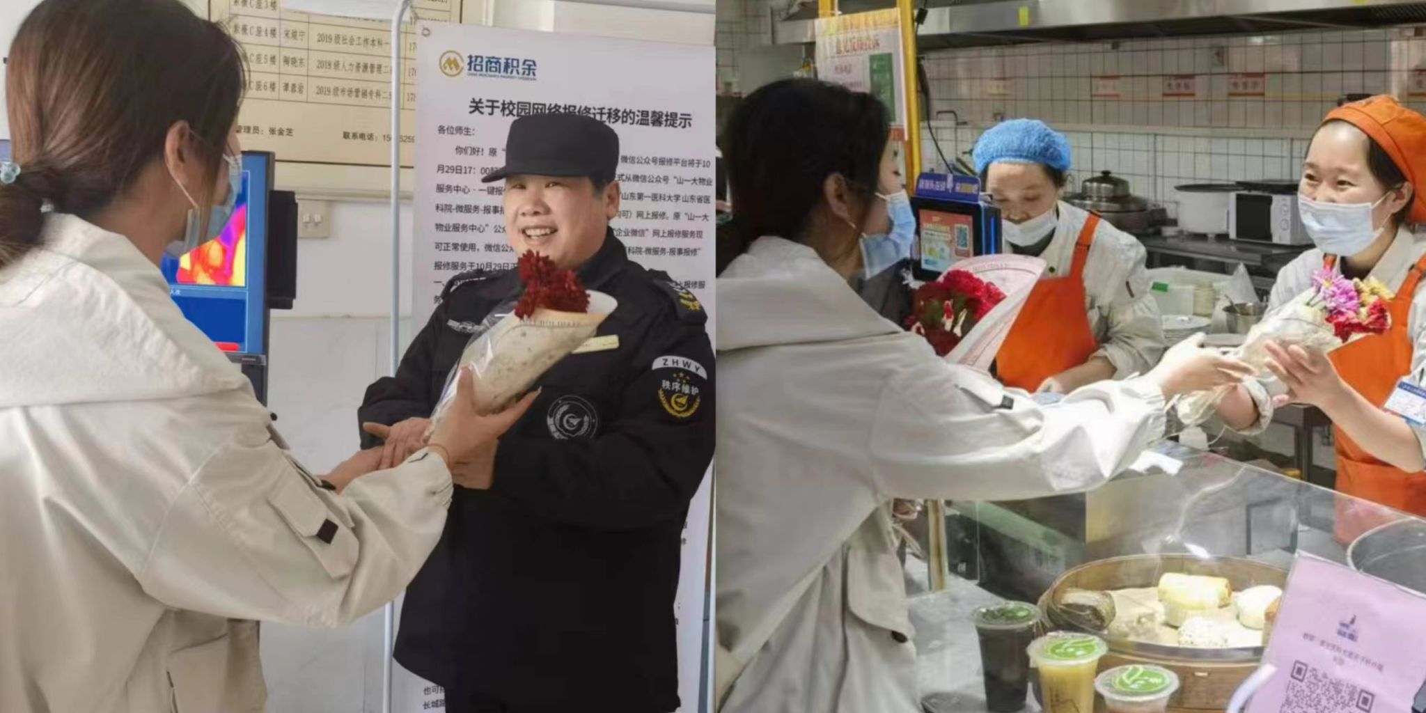 活动结束后,学院学生将包装好的花束赠予学校餐厅与宿舍的女老师们,并为她们送上了温馨的节日祝福。