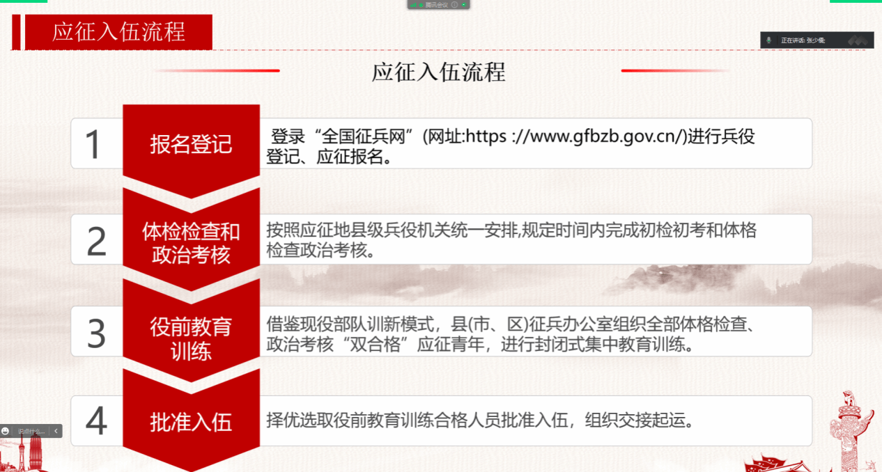 以青春之我,筑强国之梦。为深入贯彻强军思想,进一步落实国家相关征兵工作要求,帮助学生全面了解征兵政策,3月14日,诸侯ok1133官网召开“无悔军旅,无悔青春”2023应届毕业生线上征兵宣讲会,辅导员张少儒主讲。