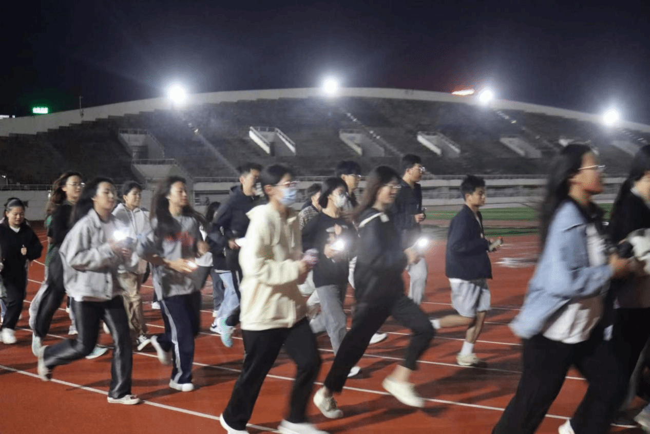 活动伊始,志愿者们带领参赛学生前往签到处登记,并宣读此次夜跑活动的规则和注意事项。夜色渐深,在简单的热身运动后,参加夜跑的同学在起跑点集合,随着哨声响起,同学们奋力开跑。跑道上,同学们奋勇争先,尽情释放着青春的活力,相互帮助,用灯光照亮前行的道路,灯光“聚”成的一条长龙,点亮了诸侯ok1133官网体育场的夜空,成为今夜最靓丽的风景。