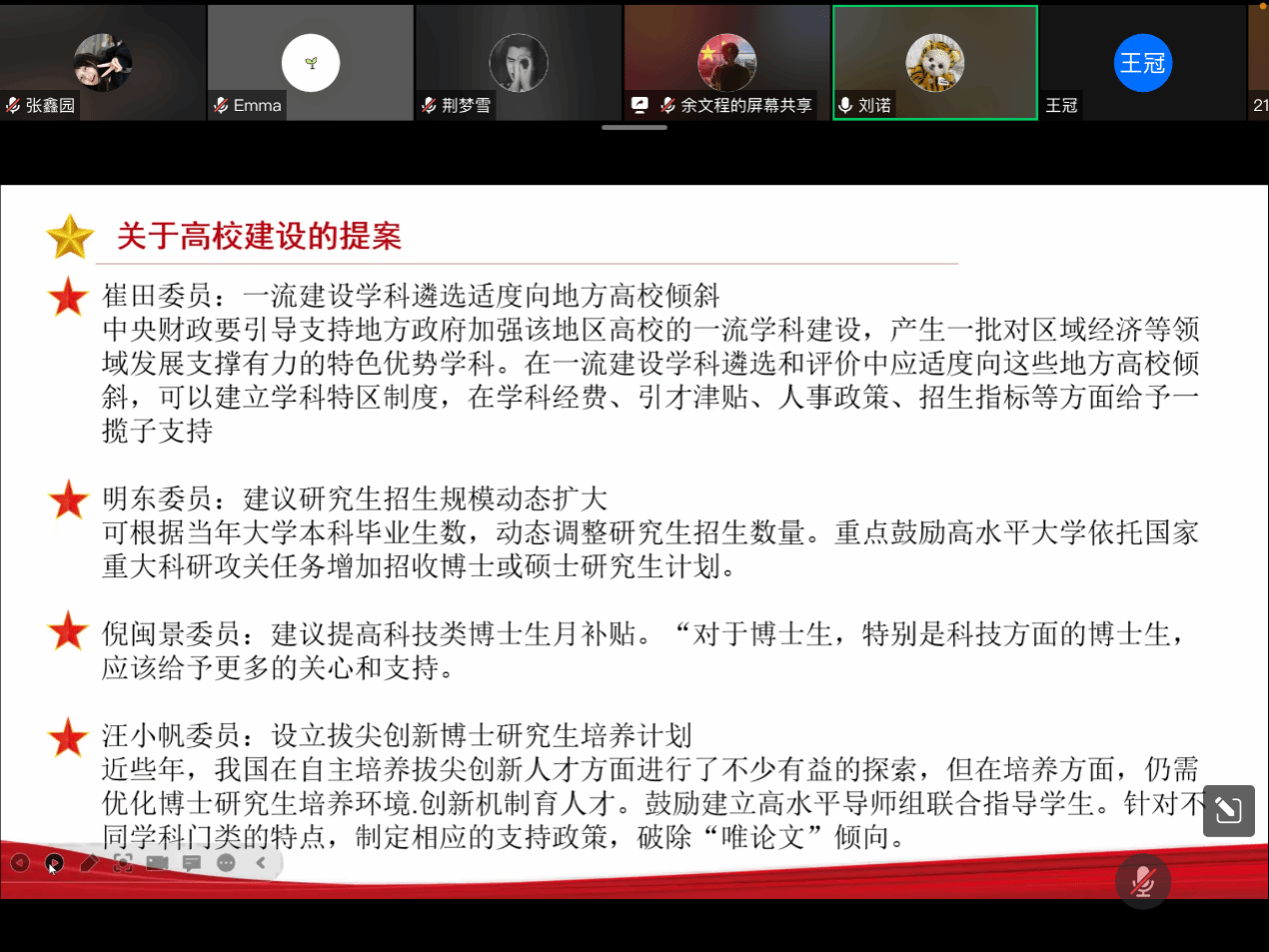 最后,刘诺同学为大家介绍两会热点中关于高校建设的提案。展示了崔田、明东、汪小帆等委员关于高校建设的提案,介绍通过培养卓越拔尖创新人才来加强高校建设的政策,进一步提高学生学习的积极性和主动性。