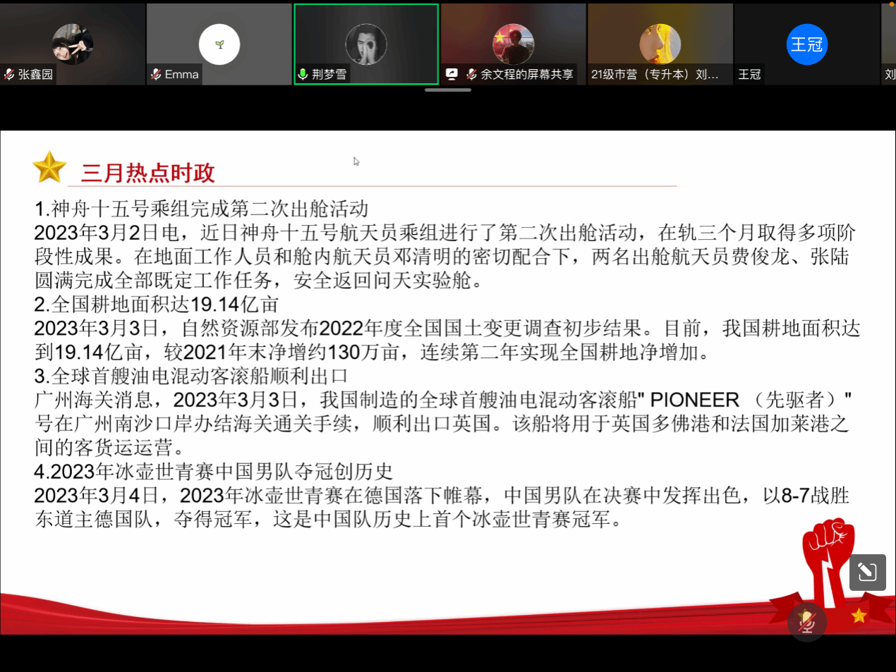 会议开始,荆梦雪同学为大家播报了3月份以来国内的热点新闻,神舟十五号顺利完成第二次出舱任务,冰壶世青赛中国男队夺冠,我国打破亚洲陆上垂直深度最深千吨井纪录。