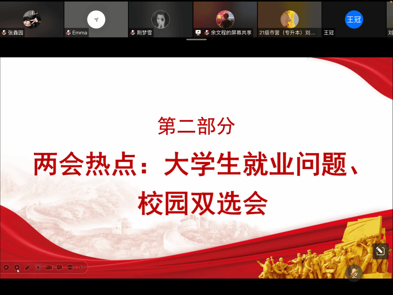 张鑫园同学讲解两会热点“大学生就业问题”,并介绍校园双选会。目前大学生就业是全社会高度关注的问题,两会委员对此提出了一系列建议,如:出台鼓励企业扩大招聘高校毕业生的相关政策、鼓励民企吸收高校毕业生、简化优化高校毕业生就业手续。此外,于3月11日举办的校园双选会在学校毕业生与用人单位之间建立起快捷的沟通桥梁,促进学生就业,进一步推动产教融合成果转化。