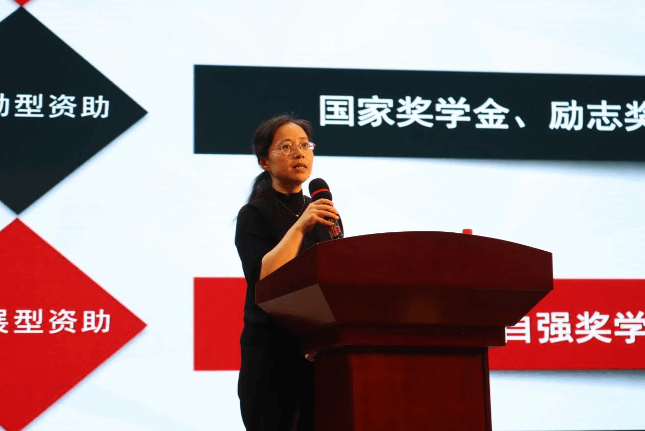 刘玉在会上进行了以“学在山一大,爱筑成才梦”为主题的学生资助政策介绍。她从学生资助管理中心的工作职能、学生资助工作体系等多个方面重点归纳讲解了奖学金和助学金的评选要求,为大家表明违纪处分的危害,鼓励同学们积极向上,努力学习。此外,她向同学们介绍了国家助学贷款的申请、偿还等相关事项,带大家深入了解国家、学校的各项资助政策和资助项目。