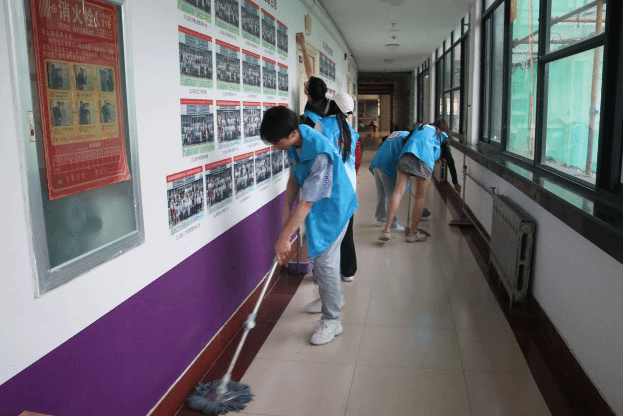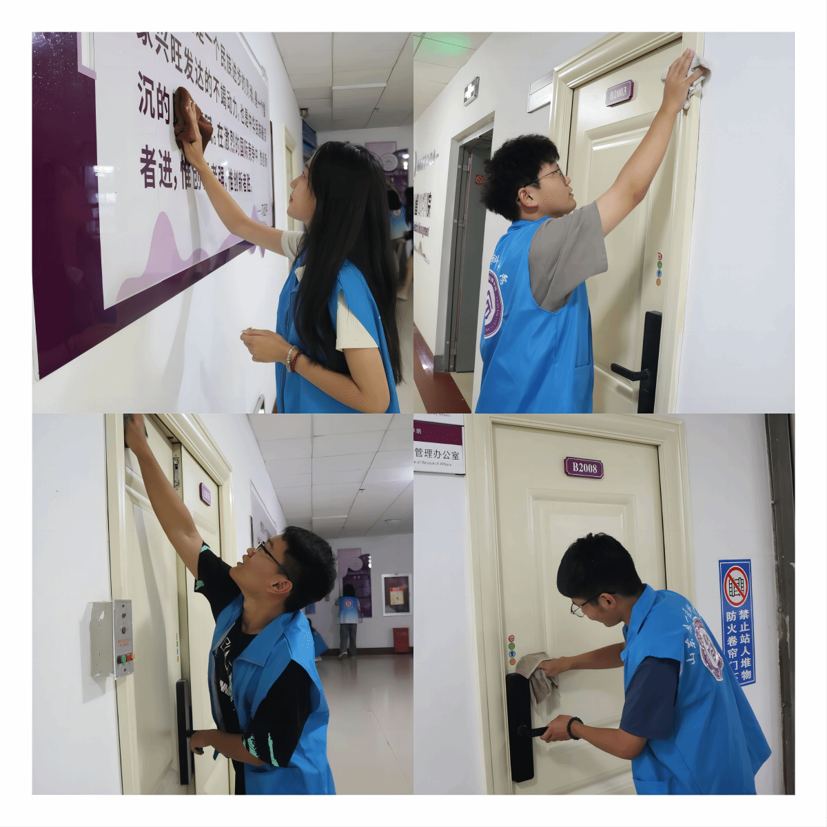 在服务队的精心组织下,志愿者们高质量高效率的完成了扫地、拖地、抹桌子、整理资料、开窗换气、整理卫生工具等任务。在清理过程中虽然弥漫着尘土和异味,但大家不怕脏、不怕累,干劲十足,不放过任何一处卫生死角。经过一个多小时的努力,办公楼的楼梯、走廊、办公室无尘土踪迹,窗户焕然一新,扶手光亮如新。楼层中跃动的蓝色身影,传递着浓浓师生情谊。在打扫卫生的活动中,大家也体会到了老师们平时工作的辛苦。同学们用自己的劳动带给老师一个整洁、舒心的办公环境。