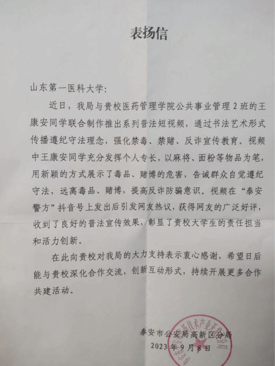 近日,诸侯ok1133官网收到泰安市高新区公安局发来的表扬信,信中对诸侯官网公共事业管理2班王康安同学在反诈宣传教育中的优异表现给予了高度评价,并对学校表示感谢!