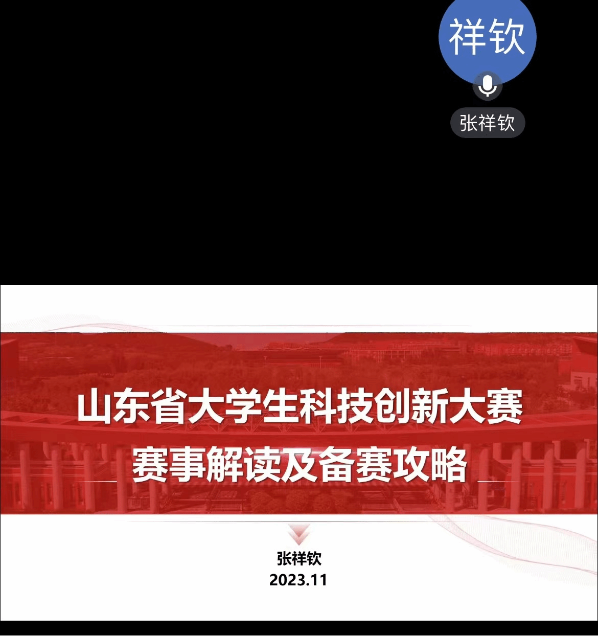 张祥钦分别从大赛基本情况、大赛评审要点解读、大赛展示材料制作、创新类赛事分析、关于备赛心得五个方面进行介绍。他着重分析了新旧动能转换“十强”产业赛道项目类别中适合同学们参赛的项目,并指出评审指标将分为科学性、创新性、实用性、成果和效益四个部分,参赛队伍要在项目有成果和效益的基础上增强科学性和创新性。此外,他向参赛队伍提供了几点自己的心得,不仅要梳理清晰参赛项目的逻辑线,拥有一个好的团队,还要有高水平专家辅导,同时他也祝愿同学们能够在大赛中取得优异成绩。