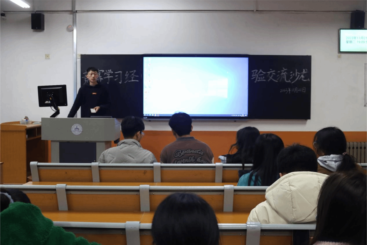 会上,胡冰涛、刘琳杰、于雪莹、张聪就自己的比赛经历向大家分享了比赛经验,他们重点围绕备赛要求、竞赛内容、比赛策略等方面,提醒同学们要制定备赛计划,在竞赛中保持冷静,从容应对竞赛中的各项挑战,学会从失败中吸取教训,不断总结经验。同时,他们建议同学们积极参加各类学科竞赛,努力夯实专业知识、提高专业技能,让自己的简历更加出彩,为日后求职做足准备。随后,同学们还就自己的疑惑进行了提问,学长学姐们耐心解答,进一步拓展了同学们对赛事的了解,在轻松融洽的交谈中也活跃了现场氛围。