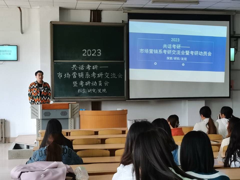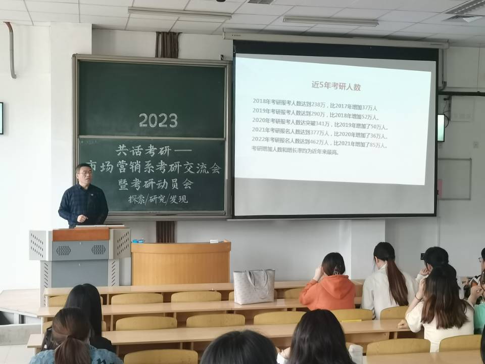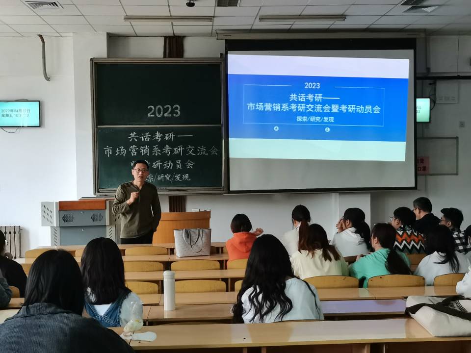 “领航工程”实施以来,市场营销系党支部与市场营销系积极下沉联系班级,认真调研,开展系列活动,助力学生成人成才。为帮助2019级和2020级市场营销专业学生更好地了解考研的各种注意事项,加强同学们对考研专业选择和研究生考试科目的认识,提高诸侯官网市场营销专业学生的考研热情,明确学生考研目标,掌握相关学习技巧,营造良好的学习氛围,于4月22日上午在教学南楼C座3010教室为市场营销专业举办考研交流会暨考研动员会。市场营销系党支部书记王滨老师、市场营销系主任马振鹏老师、市场营销系党支部支委崔行武老师出席此次会议,特别邀请赵睿智、高梦琦等五名今年考研上岸的优秀学生出席本次会议,马振鹏老师做了主题发言。